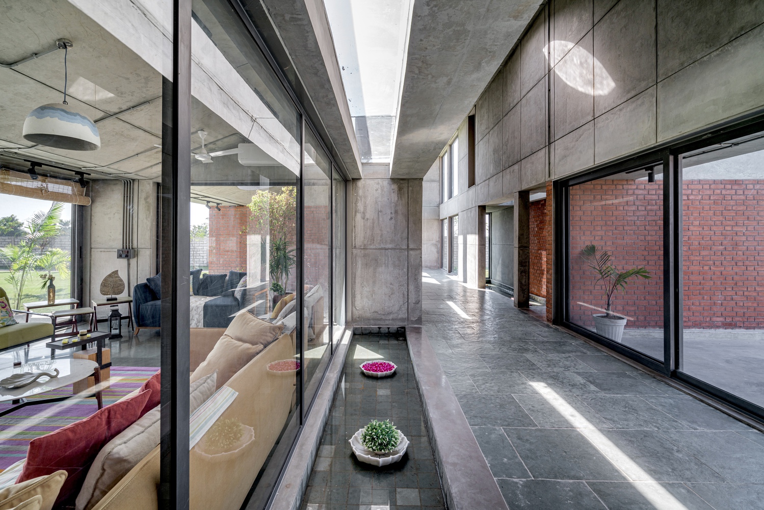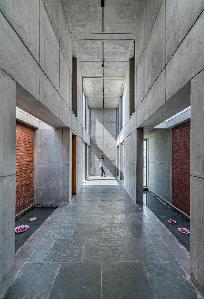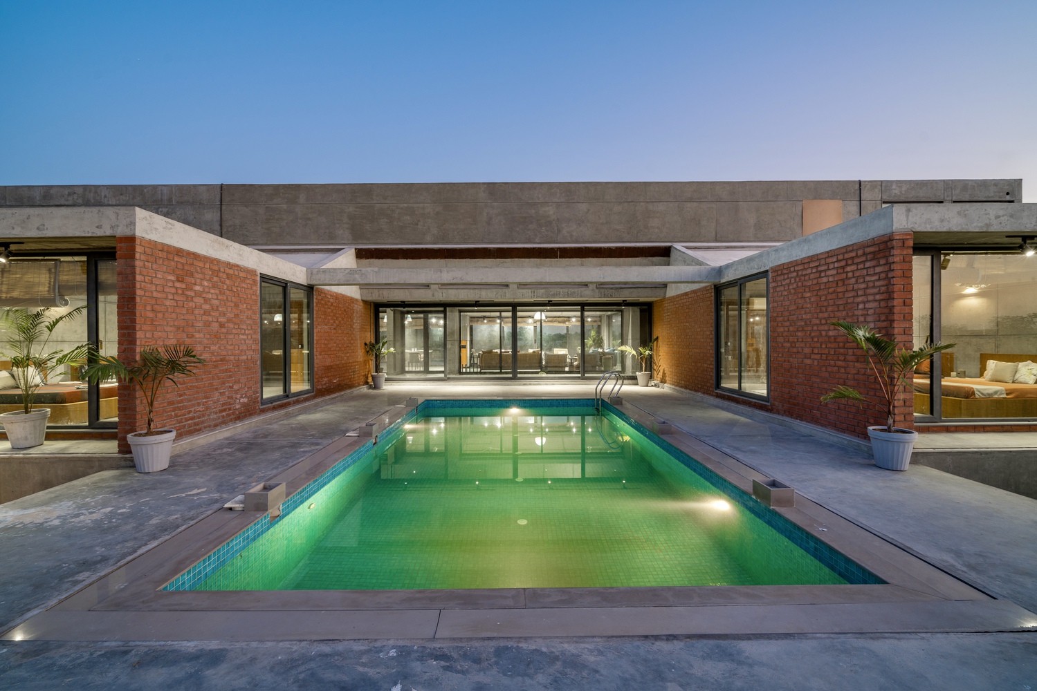 雙灣之家采用清水混凝土澆筑而成,從內(nèi)至外均采用清水混凝土做舊效果設計。建筑由南至北向兩端延伸空間,建筑與周圍的自然田園默契的相互融合。無論是黑夜或者白天雙彎之家給人們帶來一種神密之所在。