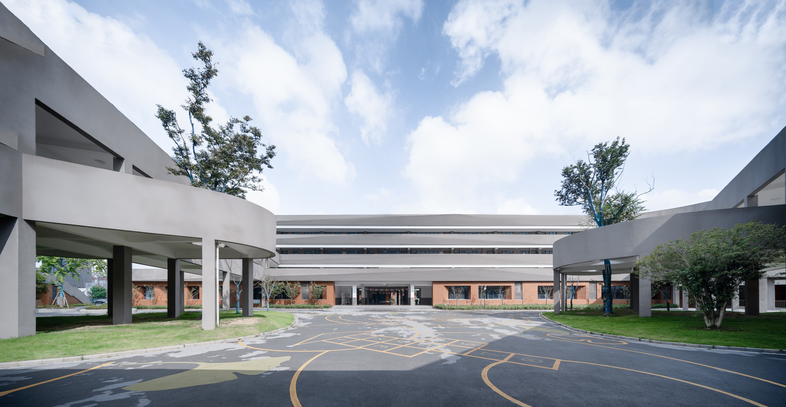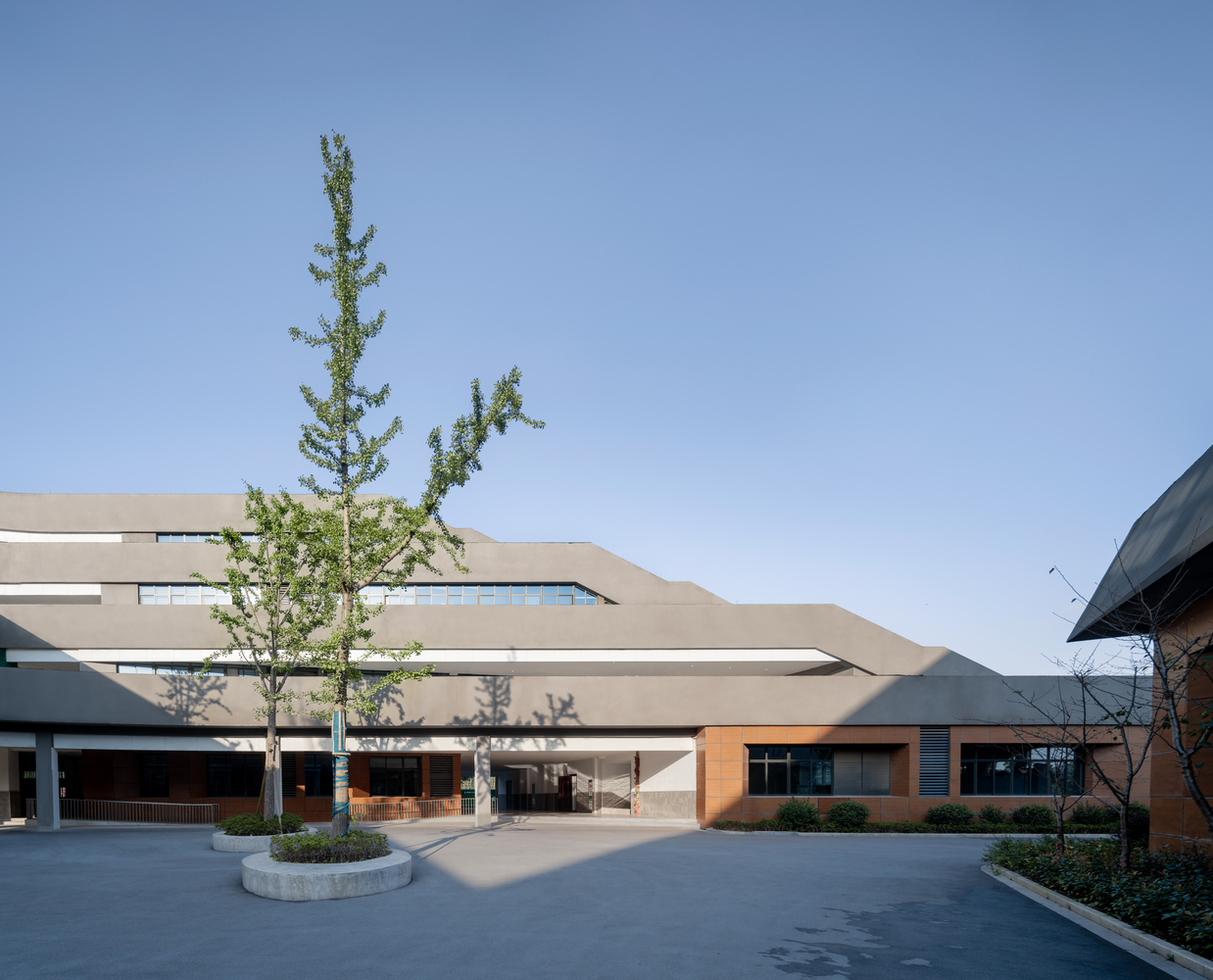 西南小學位于中國·浙江湖州經濟開發區,校園的北側為社會公園,南側隔河而望連綿漸隱的天目山脈。西南小學就選址于這山城之間,乘著這山水的靈秀,開始一段“巡檐風與月,隱幾水兼山”的建造之旅。建筑的的造形十分的奇特,以天目山的“目”字為結構,風格也十分的新穎,建筑外表皮采用清水混凝土掛板打造,以全新素顏面貌與遠處的天目山合諧的融為一體。