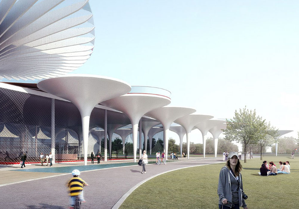 設(shè)計(jì)理念:以生態(tài)、開放、景觀化為設(shè)計(jì)理念,以傘狀結(jié)構(gòu)為建筑基礎(chǔ)單元,單個(gè)傘狀單元偏景觀化,形態(tài)鮮明;圓形段棚形成的底部空間,開放自由與環(huán)境高度融合。多個(gè)傘狀單元相鏈接,變可構(gòu)成連續(xù)的鮮明的內(nèi)部空間。