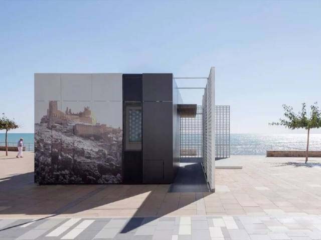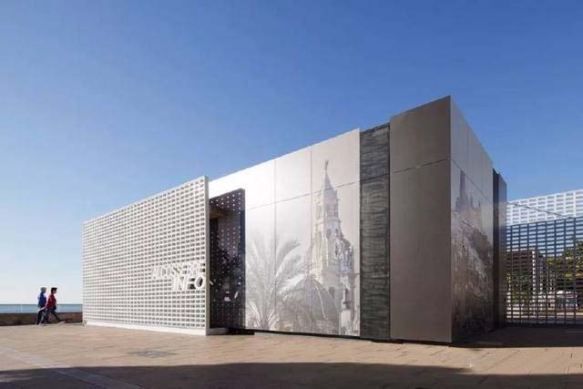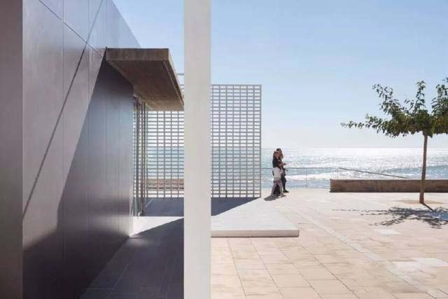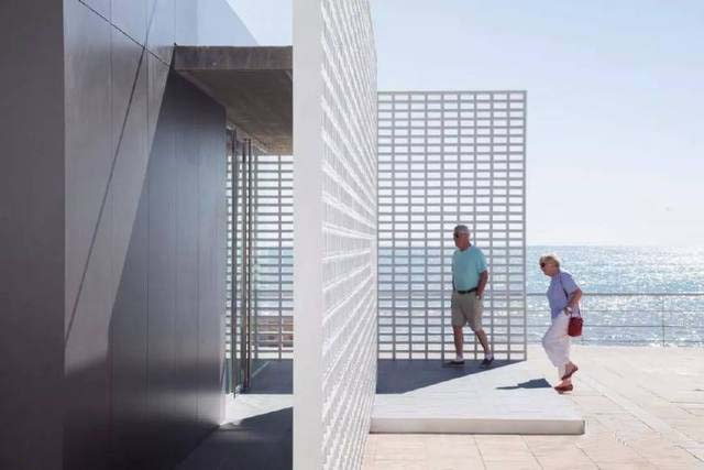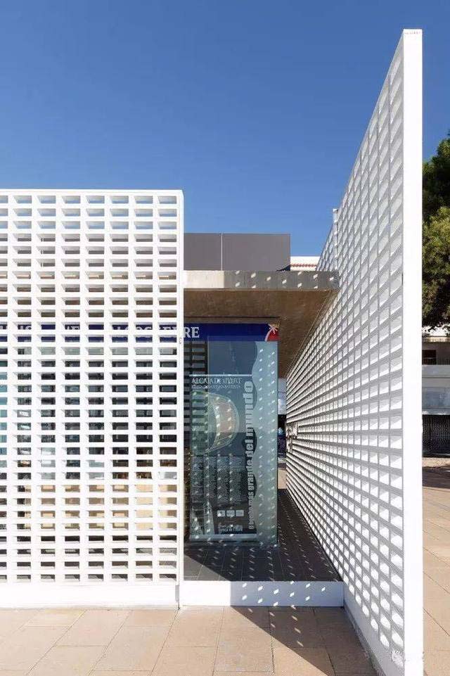 白色的正方形建筑,藍藍的大海把整個天空都渲染成藍色,通透的格柵,行走在其中仍然可以感受到海浪的聲音,陽光照射在uhpc鏤空幕墻上倒映出方塊幾何圖形,墻上的城堡從遠處看去,仿佛去到了法國古時城堡。